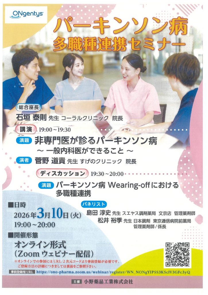 2026年1月30日 / 最終更新日時 : 2026年1月30日 大月 お知らせ パーキンソン病多職種セミナー開催のお知らせ 2026年3月10日(火)19:00~20:00に、院長石垣が座長を務めるパーキンソン病多職種セミナーがオンライン形式で開催されます。皆様のご参加をお待ちしております。 パーキンソン病セミナー資料2026.3.10ダウンロード
